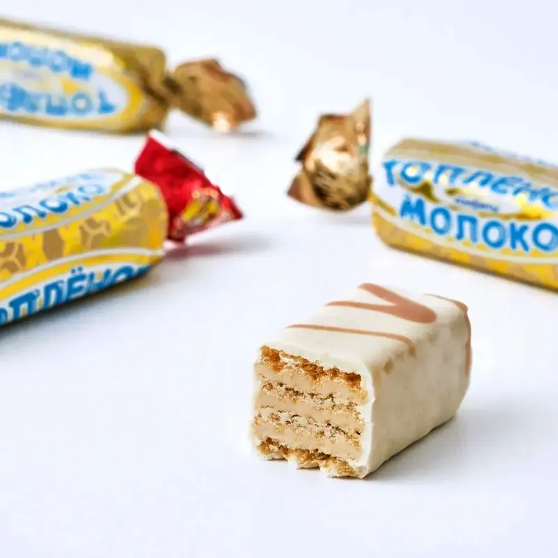 - Хрустящие вафли с нежной молочной начинкой и ароматом топлёного молока в белой глазури. Гармонично сочетается со всеми напитками. Настоящий вкус из детства порадует и взрослых, и детей. Подходит и к семейному застолью, и к офисному торжеству.