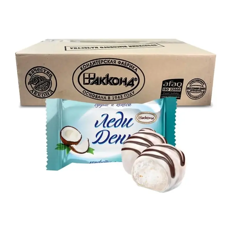 Konfektes sveramās baltās šokolādes glazūrā "АККОНД" "Леди День" ar kokosriekstu