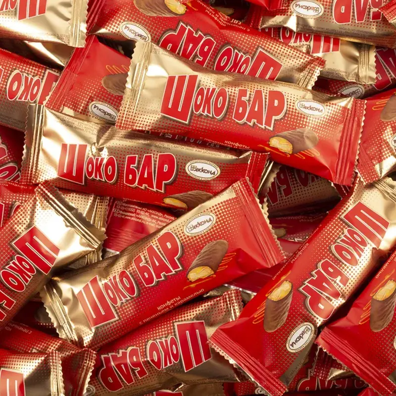 Sveramās konfektes "АККОНД" "ШОКО БАР" šokolādes glazūrā ar cepumiem un karameli