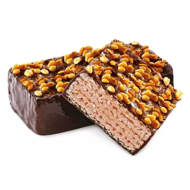 Sastāvs: konditorejas glazūra (cukurs, kakao sviesta aizstājējs (augu eļļas (ieskaitot sojas pupiņu eļļu), emulgatori: E492, saulespuķu lecitīns), kakao pulveris, emulgatori: sojas lecitīns, E47b, aromatizētājs), vafeļu plāksnes (dzeramais ūdens, augstākās kvalitātes kviešu milti, sauss olu maisījums, emulgators sojas lecitīns, sāls, cepamais pulveris nātrija bikarbonāts), cukurs, konditorejas tauki (augu eļļa, emulgators sojas lecitīns, antioksidants tokoferoli, koncentrāta maisījums), sausās piena sūkalas, sasmalcināti lazdu riekstu kodoli cukurā, kakao pulveris, rīvēti Indijas riekstu kodoli, antioksidants askorbīnskābe, aromatizētājs "Karameļu tipa sviesta karamele", emulgators: sojas lecitīns. Kontrindicēts individuālas piena olbaltumvielu un/vai olu baltumu nepanesības gadījumā. Var saturēt zemesriekstu un sezama sēklu pēdas.