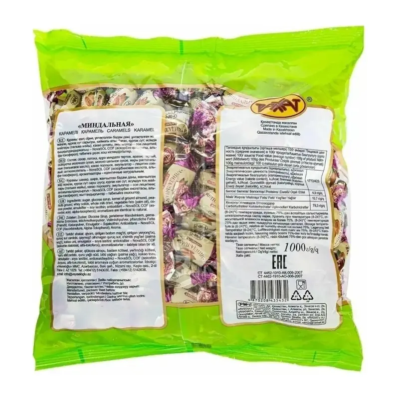 Состав: сахар, патока, ядро миндаля тертое, арахис тертый, сыворотка молочная сухая,