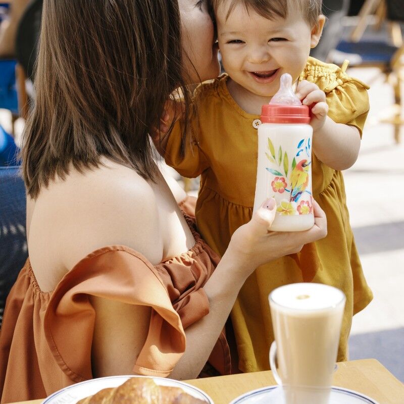 - Bērnu pudele ar platu kaklu no izturīga polipropilēna. Nesatur BPA. Ar antikoliku silikona knupīti.