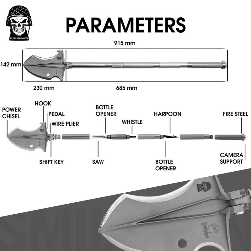 Funkcijas: lāpsta, āmurs, zāģis, cirvis, cirvis, kaplis, sirpis, šķēres, lauznis, logu pārtraucējs, svilpe, harpūna, ugunsdzēsības tērauda nazis, pudeļu nazis, stiepļu griezējs, statīvs kamerām, GoPro vai binoklis un citas