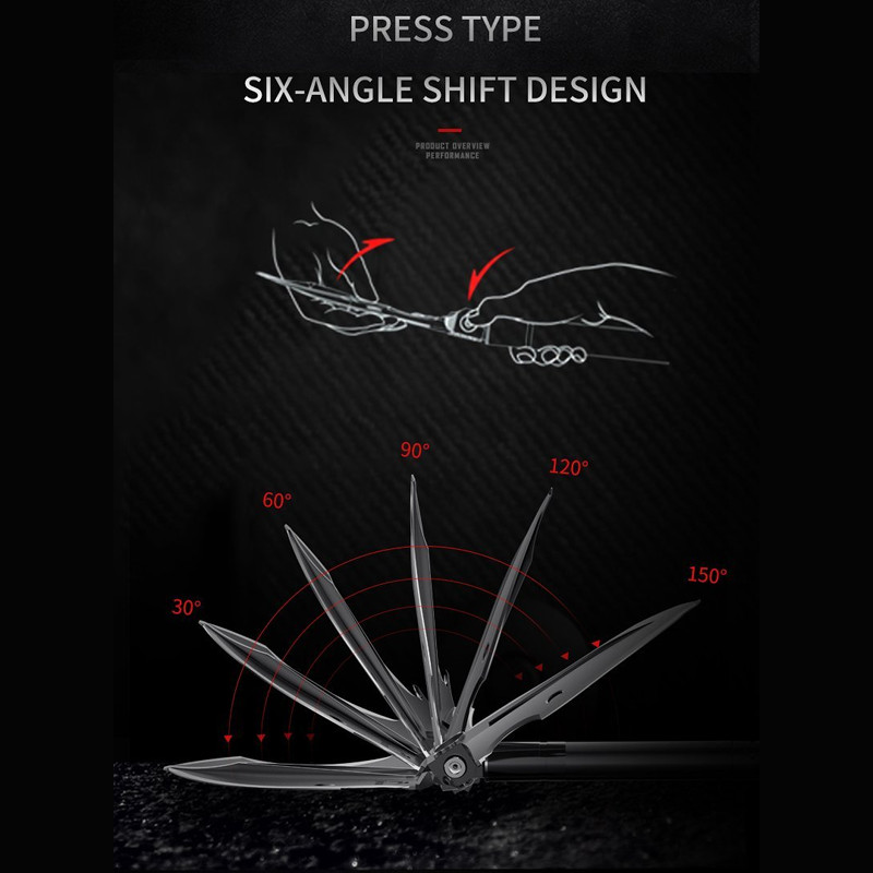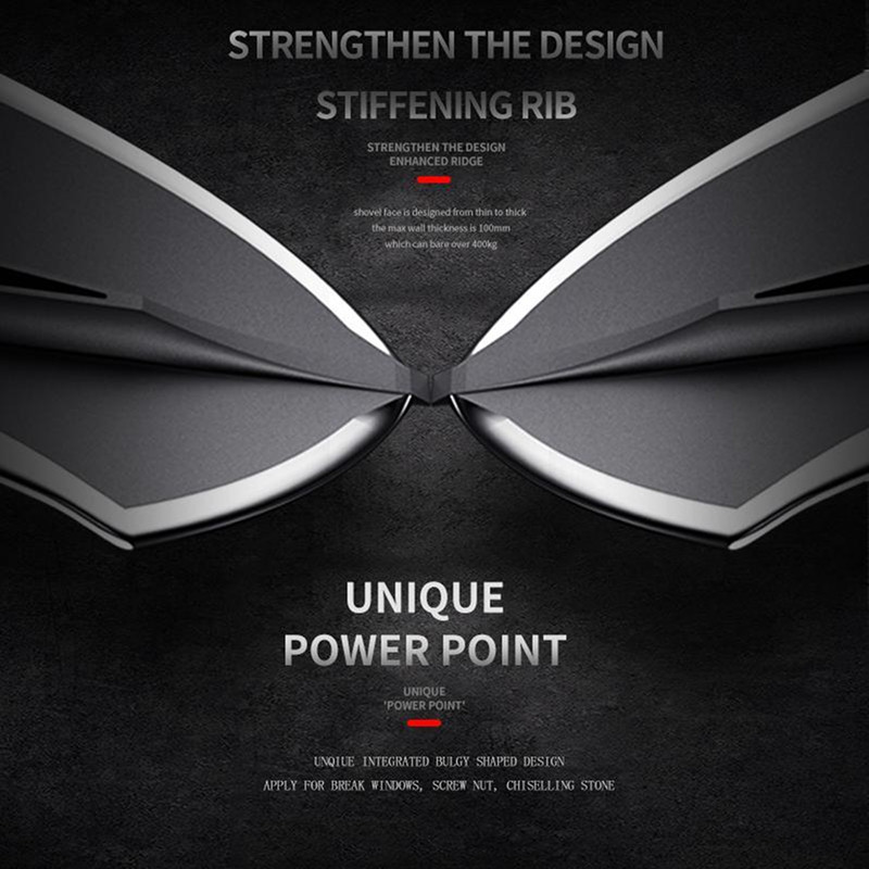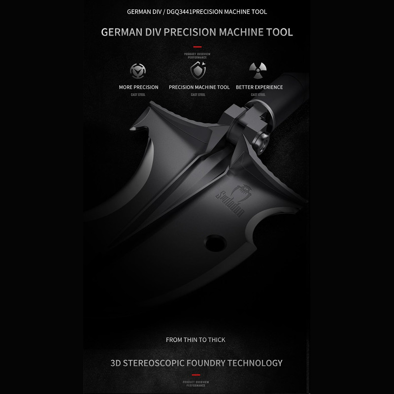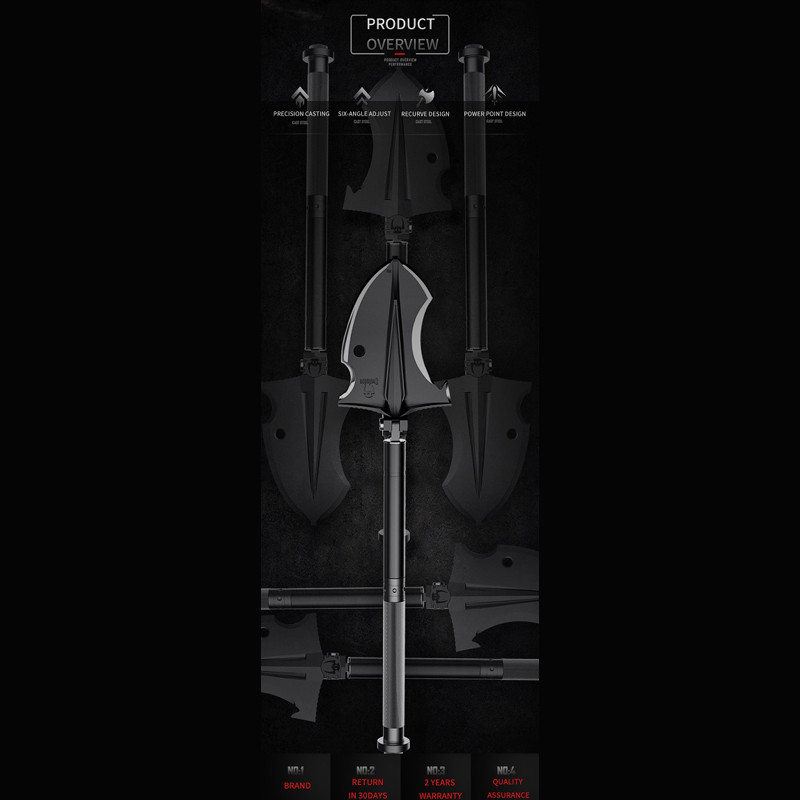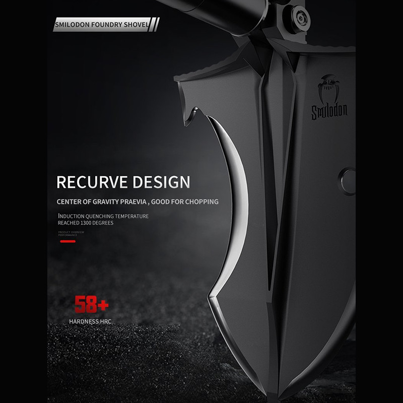 Materiāli un ražošana: precīza liešanas tehnoloģija, kas izgatavota no martensīta nerūsējošā tērauda ar 100% formēšanu un liešanu. Katrai no sastāvdaļām tiek veikts savienojuma stiprības un elastības tests. Pateicoties patstāvīgi izstrādātajai “6 pozīciju maiņas taustiņam”, vienā vienkāršā solī jūs varat salocīt lāpstas asmeni pretī paredzētajam leņķim. Kopumā šī lāpsta, iespējams, ir augstākās kvalitātes daudzfunkcionālais rīks tirgū.