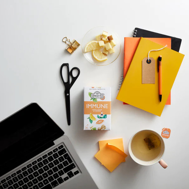 You’ll find 20 teabags in this box, string-tagged for easy brewing in a cup or pot. Each teabag is foil-sealed to lock in its flavours and ensure every infusion is as fresh as the last. Enjoy our Immune infusion any time of the day. As it’s completely caffeine-free, you can enjoy a cup of goodness at the end of a particularly busy day. It’ll help you wind down, then wake up feeling fighting fresh! With its lovely golden yellow colour and heady lemon and ginger aromas, this invigorating herbal tea will help keep you on top of your game whenever you feel your defences are lagging.
