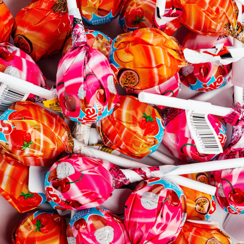 - Karamele uz kociņa. Sortimentā ir karamele uz kociņa ar piena un augļu garšas piedevām: saldējums-ķiršu, persiku-pasiorijas auglis, zemeņu-banānu. Karamele ir izgatavota, pievienojot pienu un dabiskās krāsvielas. Sastāvdaļas: cukurs, melase, saldināts iebiezinātais pilnpiens (pilnpiens, vājpiens, cukurs (saharoze), laktoze); skābuma regulētājs: citronskābe; nesējs: glicerīns; aromatizētāji, krāsvielas: titāna dioksīds, kurkumīns; koncentrēta purpura burkānu sula. Produkts var saturēt sēra dioksīdu.