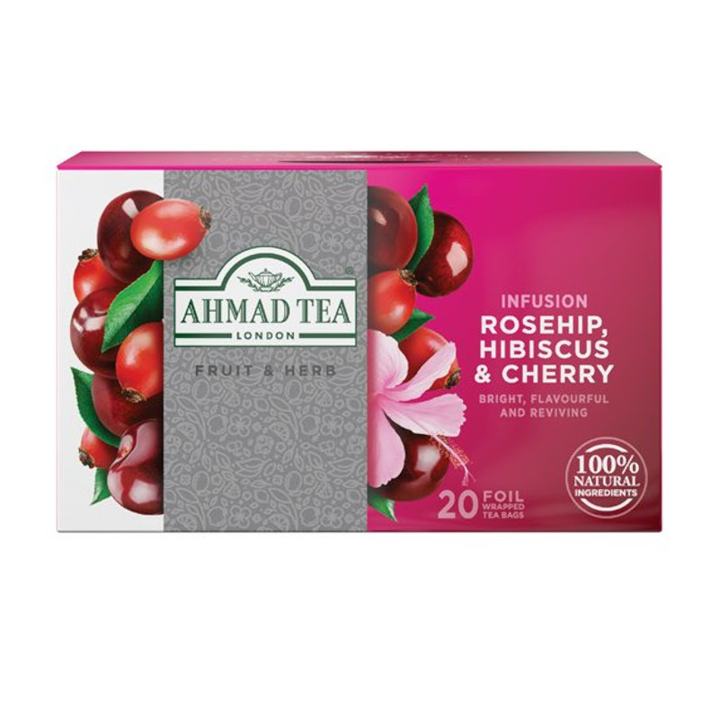 Zāļu tēja AHMAD mežrozīšu, hibisku un ķiršu tēja 20 maisiņi pa 2g katrā