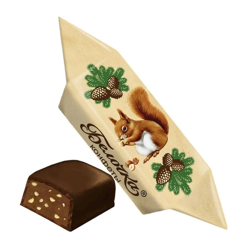 Konfektes "Белочка" ar drupinātiem lazdu riekstiem, glazētas ar šokolādes glazūru