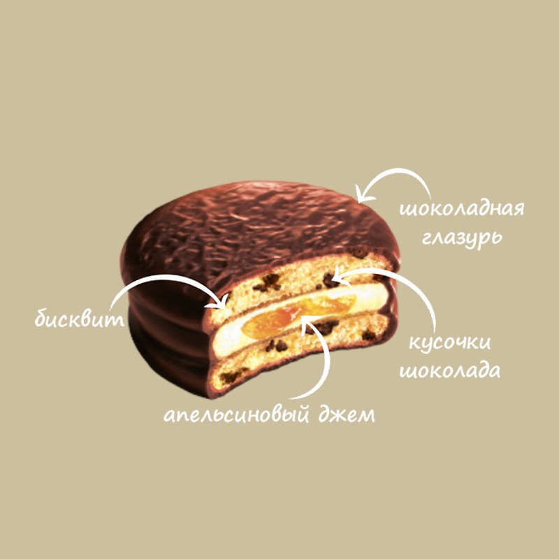 - Choco Pie Chocochip neparastā tekstūra atklājas cietas šokolādes, gaisīgas biskvīta, maigas suflē un sulīgā apelsīna kombinācijā. Šokolāde uzlādē organismu ar nepieciešamo enerģiju, piens bagātina to ar kalciju, bet papildu sastāvdaļa – apelsīnu ievārījums – pievieno svaigas notis, padarot produktu pārsteidzoši vieglu un garšīgu.