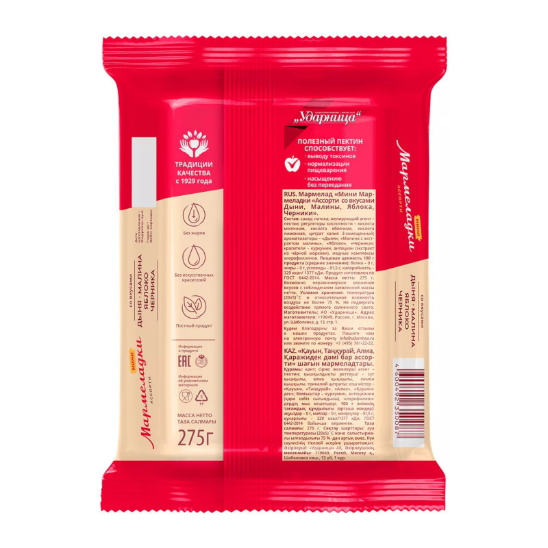- Marmelāde "Ударница" "Asorti" Melone, Aveņu, Ābolu, Melleņu. Sastāvā izmantotas tikai dabīgas sastāvdaļas, un kā želējošs līdzeklis tiek izmantots pektīns – unikāla dabīga viela, kas iegūta no citrusaugļiem. Pektīns ir labvēlīgs visam organismam, īpaši sirdij, asinsritei, zarnām, kā arī spēj izvadīt no organisma kaitīgās vielas, piemēram, smagos metālus un radionuklīdus.