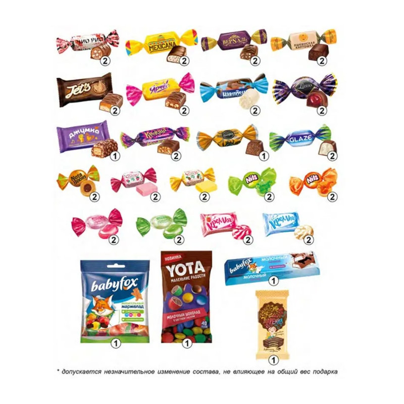 Ingredients: sugar, vegetable oils, molasses, roasted peanut kernels, milk chocolate (sugar, whole milk powder, cocoa butter, cocoa mass, skimmed milk powder, milk fat, emulsifiers: lecithins (soy), E476; flavoring. Content in chocolate mass: total dry cocoa residue - not less than 29.5%, dry non-fat cocoa residue - not less than 3.5%, dry non-fat residue of dairy products - not less than 19.5%, milk fat - not less than 7.5%; whole condensed milk with sugar (whole milk, skimmed milk, sugar (sucrose), lactose); dry whey, canned milk containing milk with milk fat substitute (sugar (sucrose), skimmed milk, dry milk whole, dry whey, milk fat substitute (refined deodorized vegetable oils in natural and modified form: palm and its fractions, sunflower, antioxidant - concentrate of mixed tocopherols), thickener - maltodextrin, stabilizer (E1442, carrageenan), food flavoring (sweet cream butter, whey protein concentrate, food flavoring "Cream"