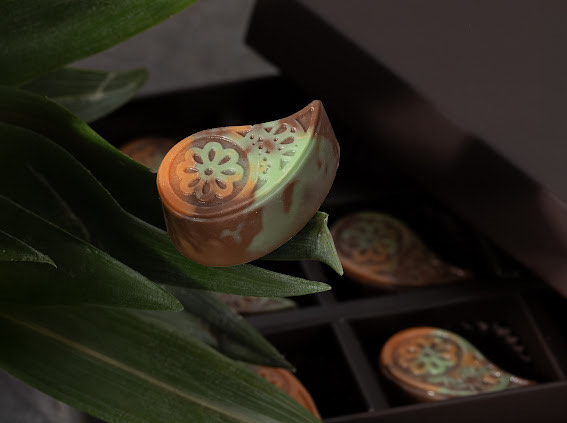 Tender pistachio paste in a combination with crispy kataifi dough, coated with milk chocolate and a lacy pattern