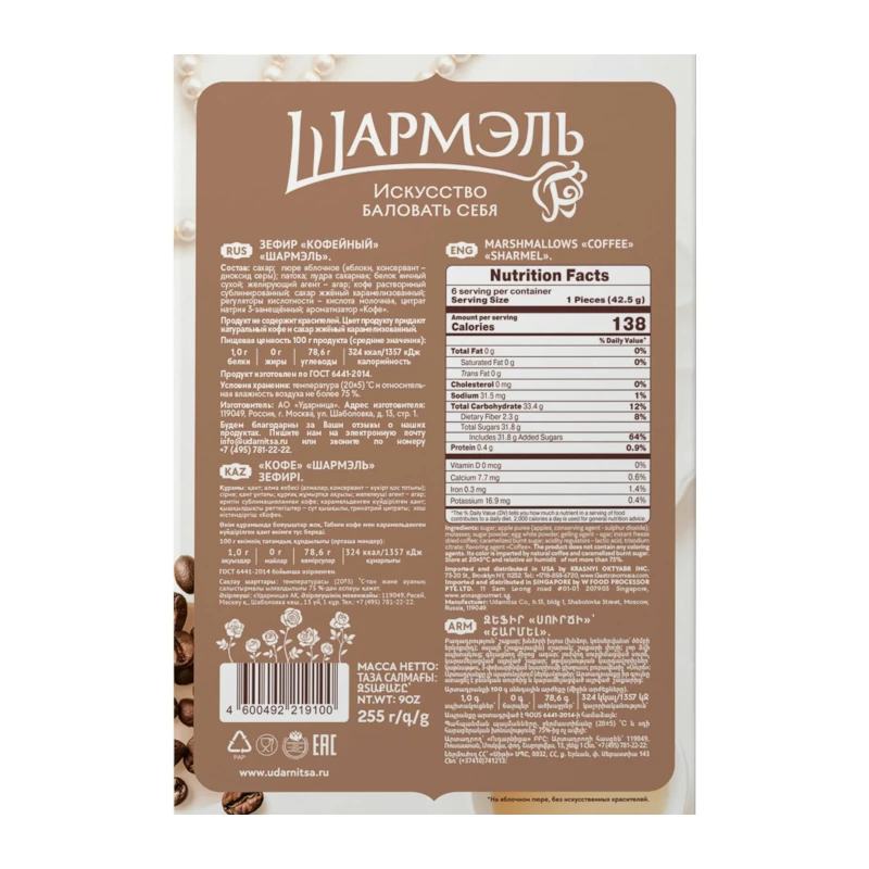 - Elegants deserts ar dabīgas kafijas garšu un aromātu. Tik smalku, gaisīgu gardumu šokolādes glazūrā var atļauties jebkura sieviete. Tās serde ir sagatavota pēc tradicionālās receptes no ābolu mērces, olu baltuma un agara, kas ir želejviela, kuras pamatā ir brūno jūraszāļu ekstrakts. Produkta virspuse ir pārklāta ar lielisku tumšo šokolādi. Nepārspējamais mutē kūstošā pildījuma un kraukšķīgās čaumalas kombinācija neatstās vienaldzīgu nevienu saldumu cienītāju. Visi produkti ir izgatavoti tikai no glutēnu nesaturošām izejvielām un nesatur ĢMO.