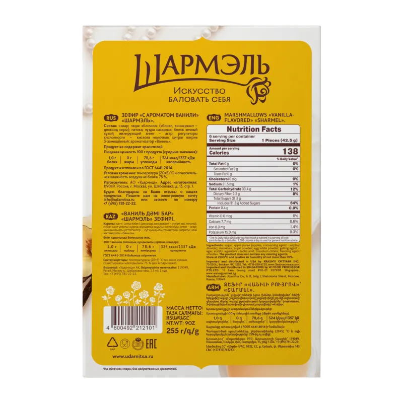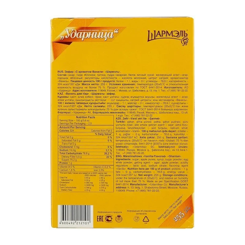 Sastāvs: granulēts cukurs, ābolu mērce (āboli, konservants - sēra dioksīds), melase, pūdercukurs; sausais olu baltums, želejviela - agars, skābuma regulētājs - pienskābe; nātrija citrāts, ābolu pulveris, aromatizētājs.
