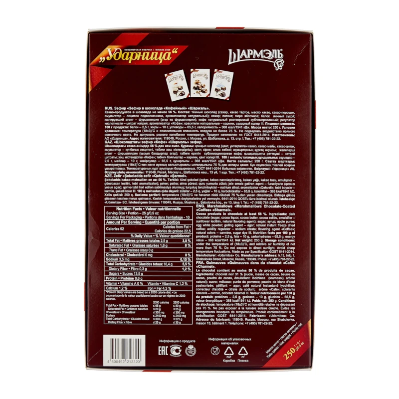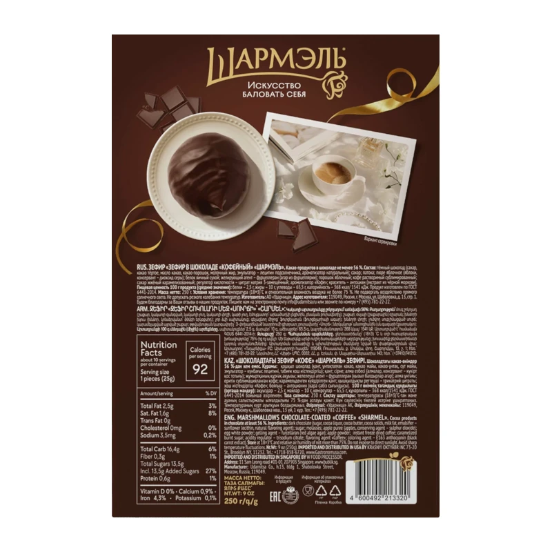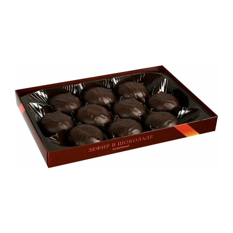 - Elegants deserts ar dabīgas kafijas garšu un aromātu. Tik smalku, gaisīgu gardumu šokolādes glazūrā var atļauties jebkura sieviete. Tās serde ir sagatavota pēc tradicionālās receptes no ābolu mērces, olu baltuma un agara, kas ir želejviela, kuras pamatā ir brūno jūraszāļu ekstrakts. Produkta virspuse ir pārklāta ar lielisku tumšo šokolādi. Nepārspējamais mutē kūstošā pildījuma un kraukšķīgās čaumalas kombinācija neatstās vienaldzīgu nevienu saldumu cienītāju. Visi produkti ir izgatavoti tikai no glutēnu nesaturošām izejvielām un nesatur ĢMO.