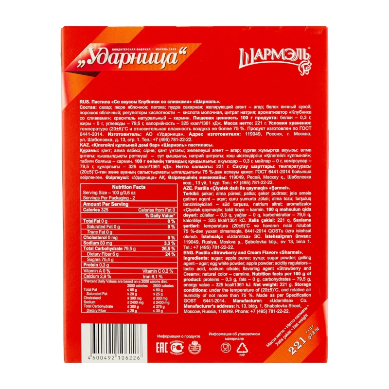 Sastāvs: cukurs, ābolu mērce (āboli, konservants - sēra dioksīds), melase, pūdercukurs, želejviela - agars, sausais olas baltums, ābolu pulveris, skābuma regulētāji - pienskābe, 3-aizvietots nātrija citrāts, "Zemeņu un krējuma" aromatizētājs, krāsviela: karmīns.