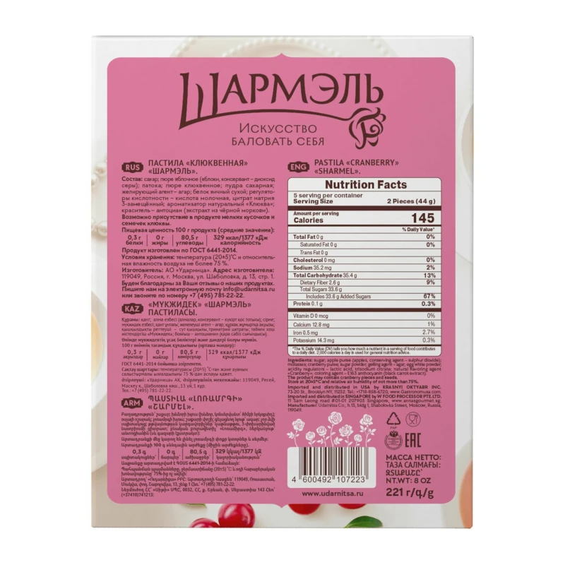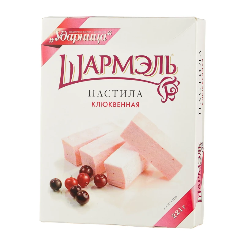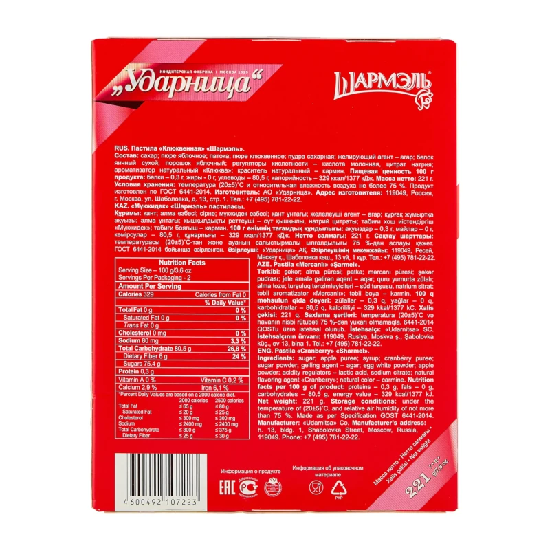 Sastāvs: cukurs, ābolu biezenis, dzērveņu biezenis, melase, pūdercukurs, agars, olu baltums, ābolu pulveris, skābuma regulētāji: pienskābe, nātrija citrāts; dabīgs aromatizētājs, krāsviela - karmuzīns var saturēt piena pulvera pēdas moisine var saturēt piena pulvera pēdas