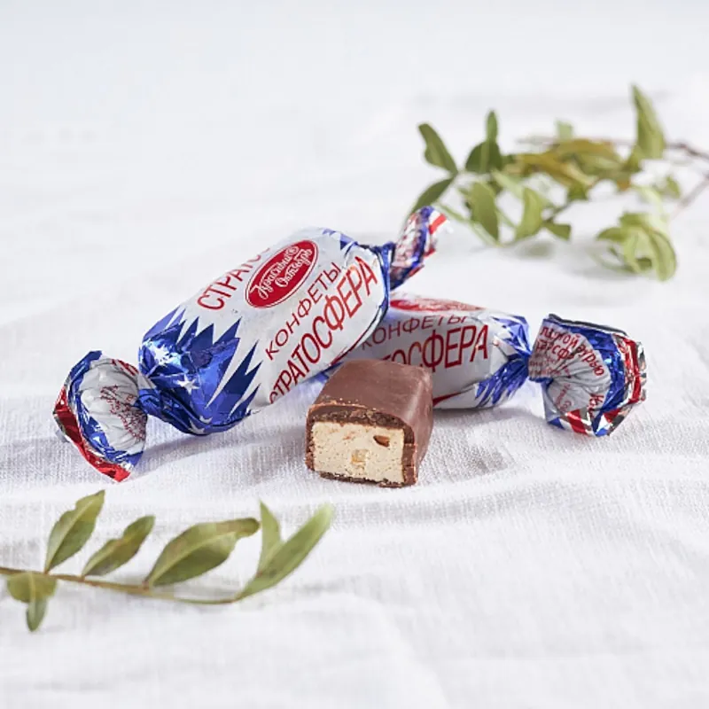 - "Стратосфера" konfektes ir vienas no tām, kuras sauc par leģendārām. Kopš PSRS laikiem to dizains un garša nemaz nav mainījusies: tā pati smalkā suflē, kurā kā meteorītu lauskas pūkainos mākoņos slīkst sasmalcinātu mandeļu gabaliņi. Slaidais konfekšu ķieģelis ir pārklāts ar bagātīgu šokolādes glazūras kārtu.