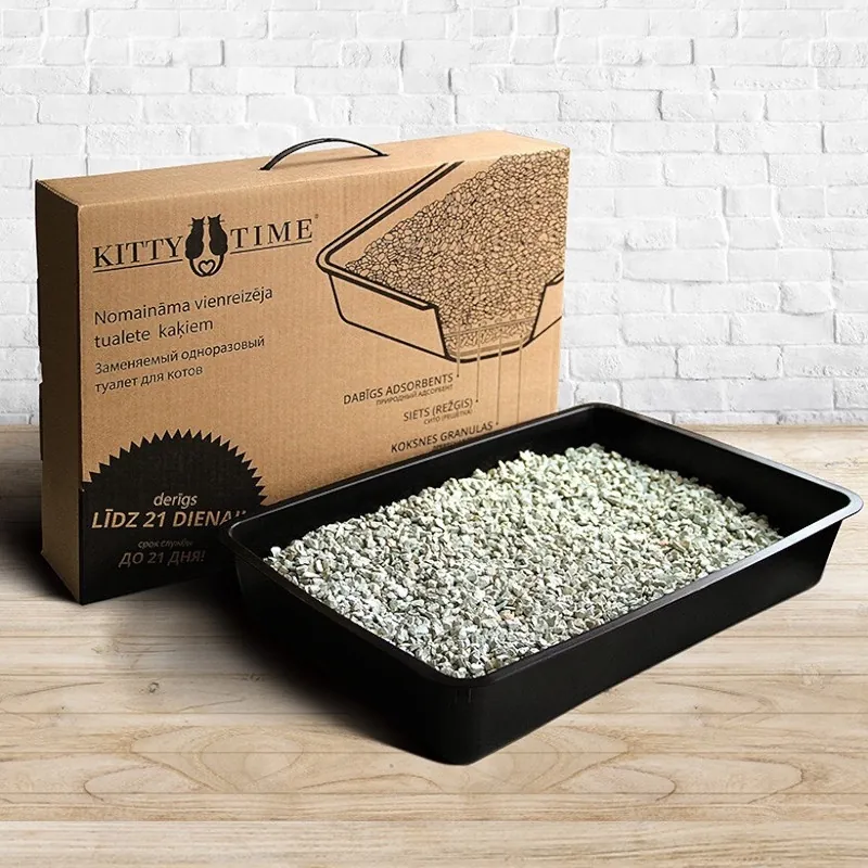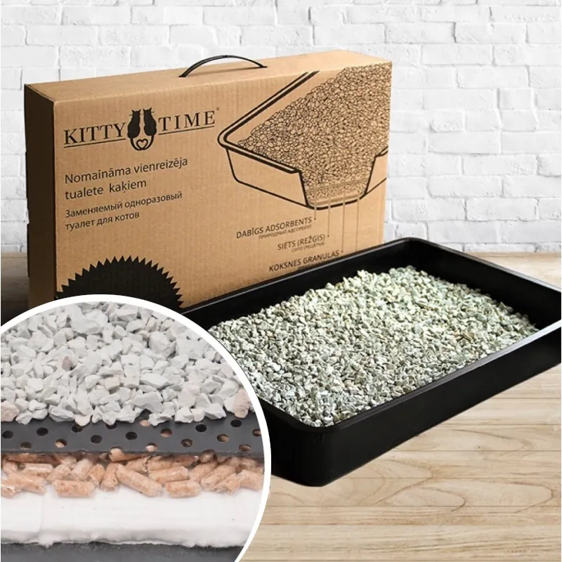 - Kitty Time tualetes komplekts sastāv no paplātes, kuras apakšā atrodas daudzslāņu absorbējošs spilvens, virs kura ir augstākās klases skujkoku granulu slānis, kas absorbē un dezinficē dabisko īpašību dēļ. Nākamais nāk sadalīšanas siets, kas sadaļa zemākos absorbējošos slāņus no augšējā slāņa. Augšējais slānis ir dabisks absorbents, kas arī absorbē un attīra gaisu no smaržas. Dabīgais absorbents - pilnīgi drošs un pat lietojams pārtikas piedevās.