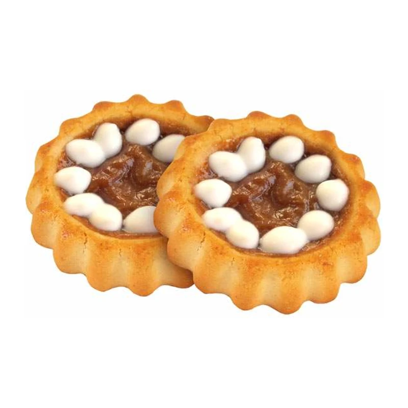 - Smilšu cepumi ar "iebiezinātā piena" pildījumu, dekorēti ar baltu konditorejas glazūru.