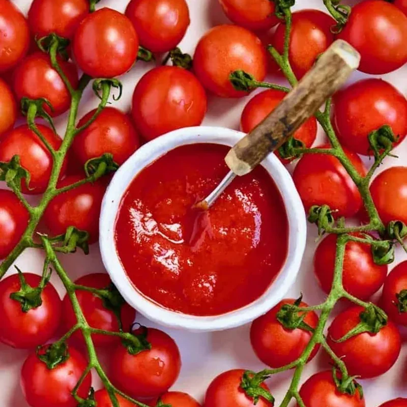 Sastāvs: ūdens, tomātu pasta, cukurs, ciete, ābolu biezenis, sāls, etiķskābe, sarkanie saldie pipari, ķiploki, pētersīļi, malti melnie pipari, tomāti.