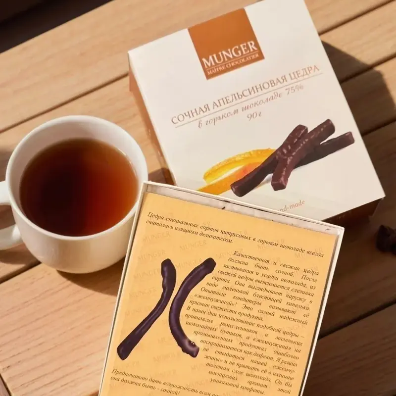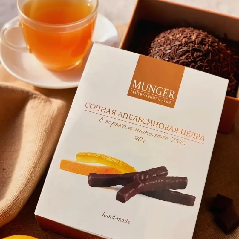 MUNGER Maitre Chocolatier sukādes apelsīnu miziņas tumšajā šokolādē