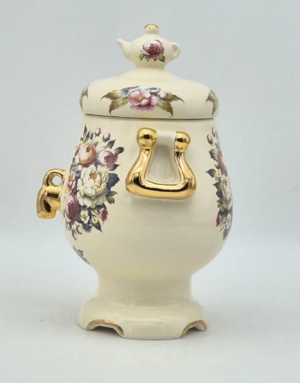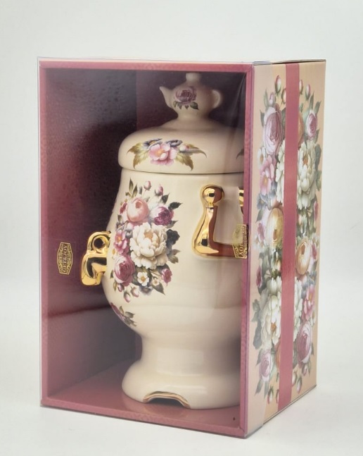 - Keramikas tējas krūzīte-samovars ar noņemamu vāku. Iepakota dāvanu kartona kastītē ar izgrieztu lodziņu.