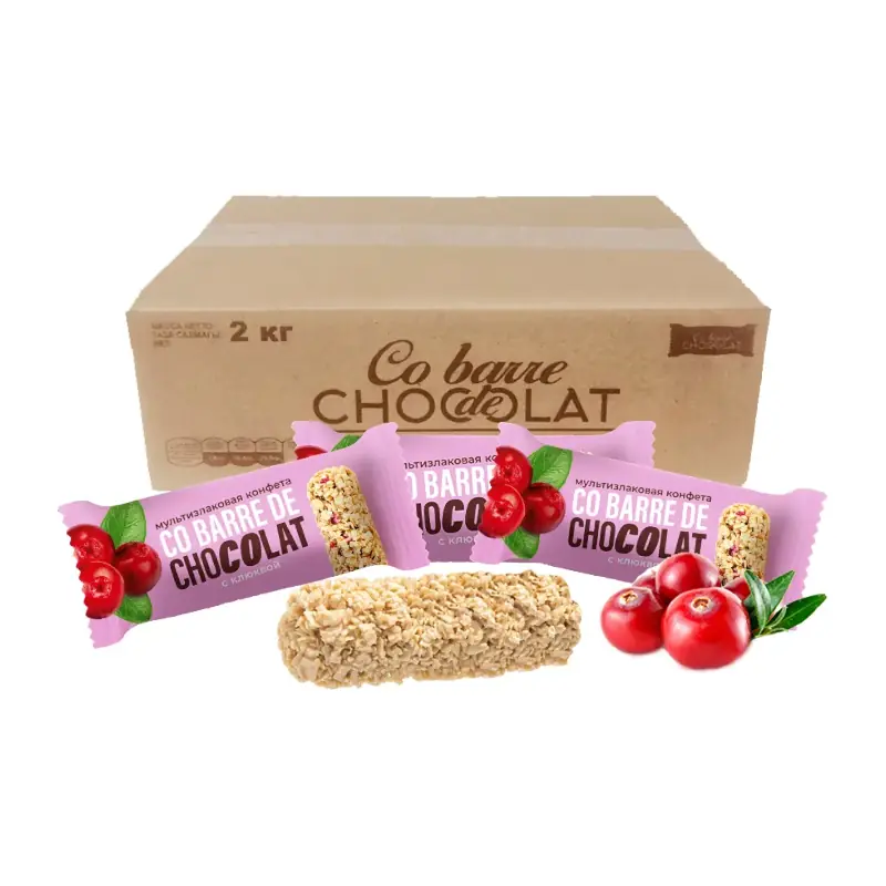 - Co Barre de Chocolat dzērveņu konfektes baltā glazūrā. Daudzgraudu konfektes, kas ietver sevī visas graudaugu priekšrocības.