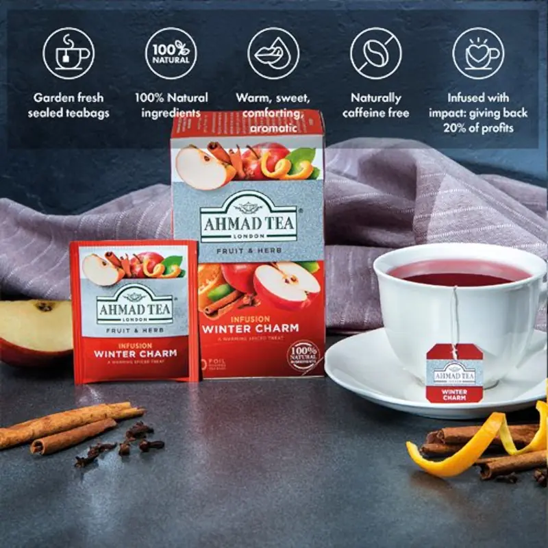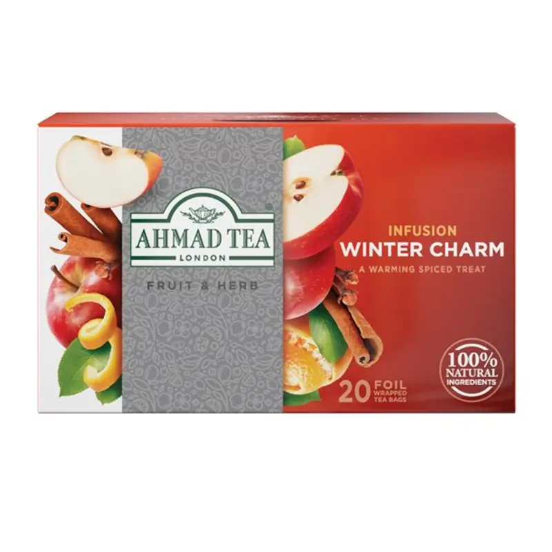 Mēs atsevišķi iesaiņojam folijā katru tējas maisiņu, lai saglabātu tējas garšu. Tas nozīmē, ka Jūs varat palutināt sevi ar gardu Winter Charm augļu tējas tasi jebkurā vietā, kur dodaties Ziemassvētku brīvdienās. Šīs tējas aromāts ar pikantām un augļu notīm noteikti nomierinās un sniegs komforta sajūtu pat pirms iedzersiet pirmo malku. Mums šķiet, ka vislabāk šo tēju ir baudīt zem segas. Tā arī dabīgi nesatur kofeīnu, tāpēc Jūs varat izbaudīt tasi šī karstā dzēriena, lai atslābinātos pirms gulētiešanas.