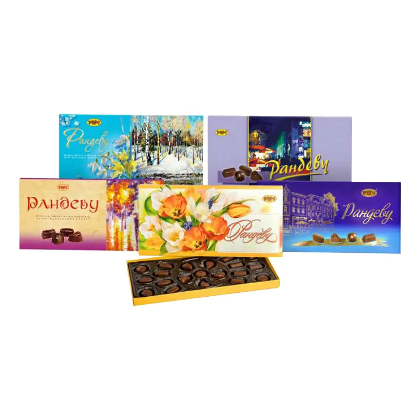 - Šokolādes konfekšu asorti ar fondanta pildījumu: vaniļas krēmbrulē; vaniļas šokolāde; krēmīga piena-krējuma garša; kokosriekstu fondanta-liķiera garša.